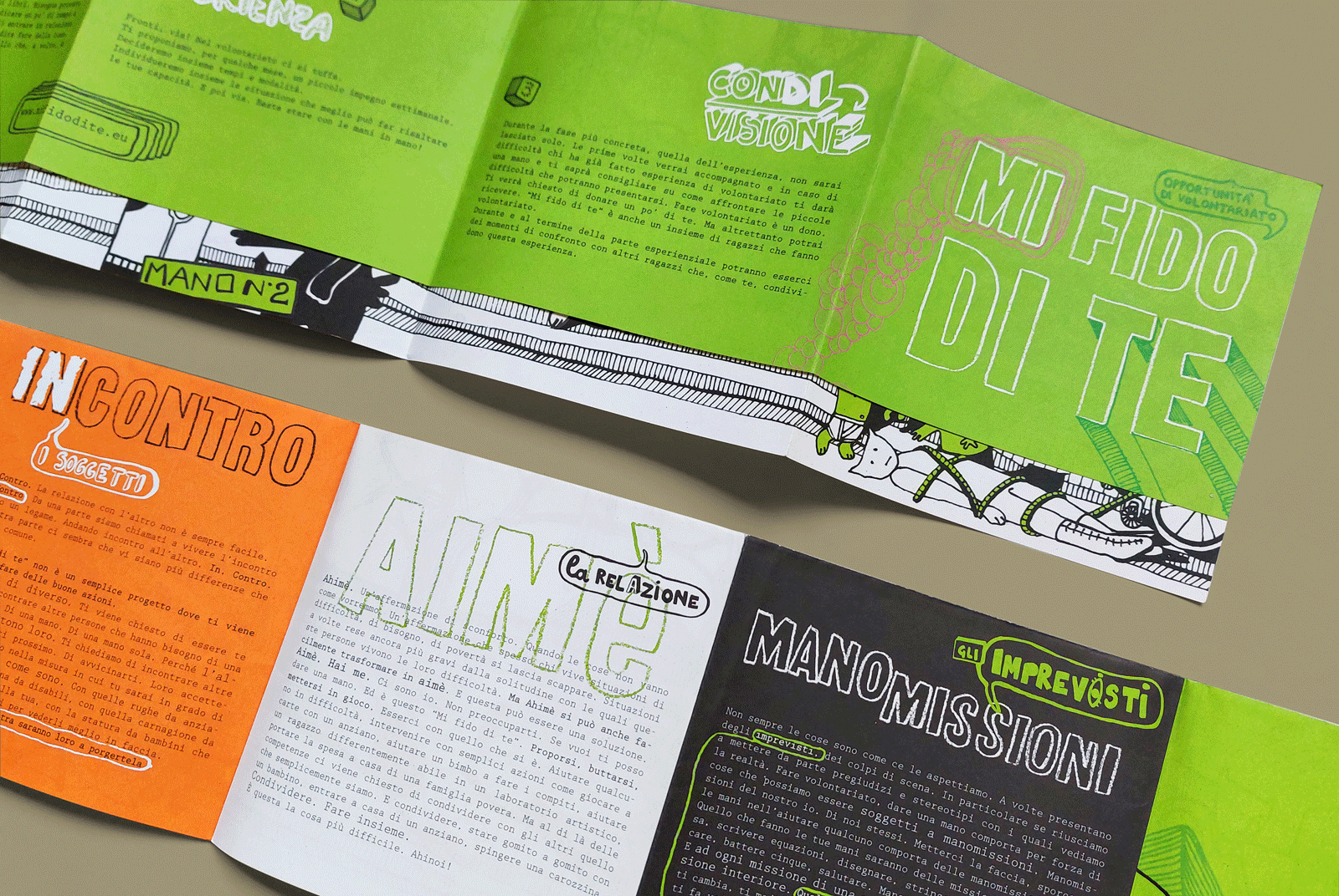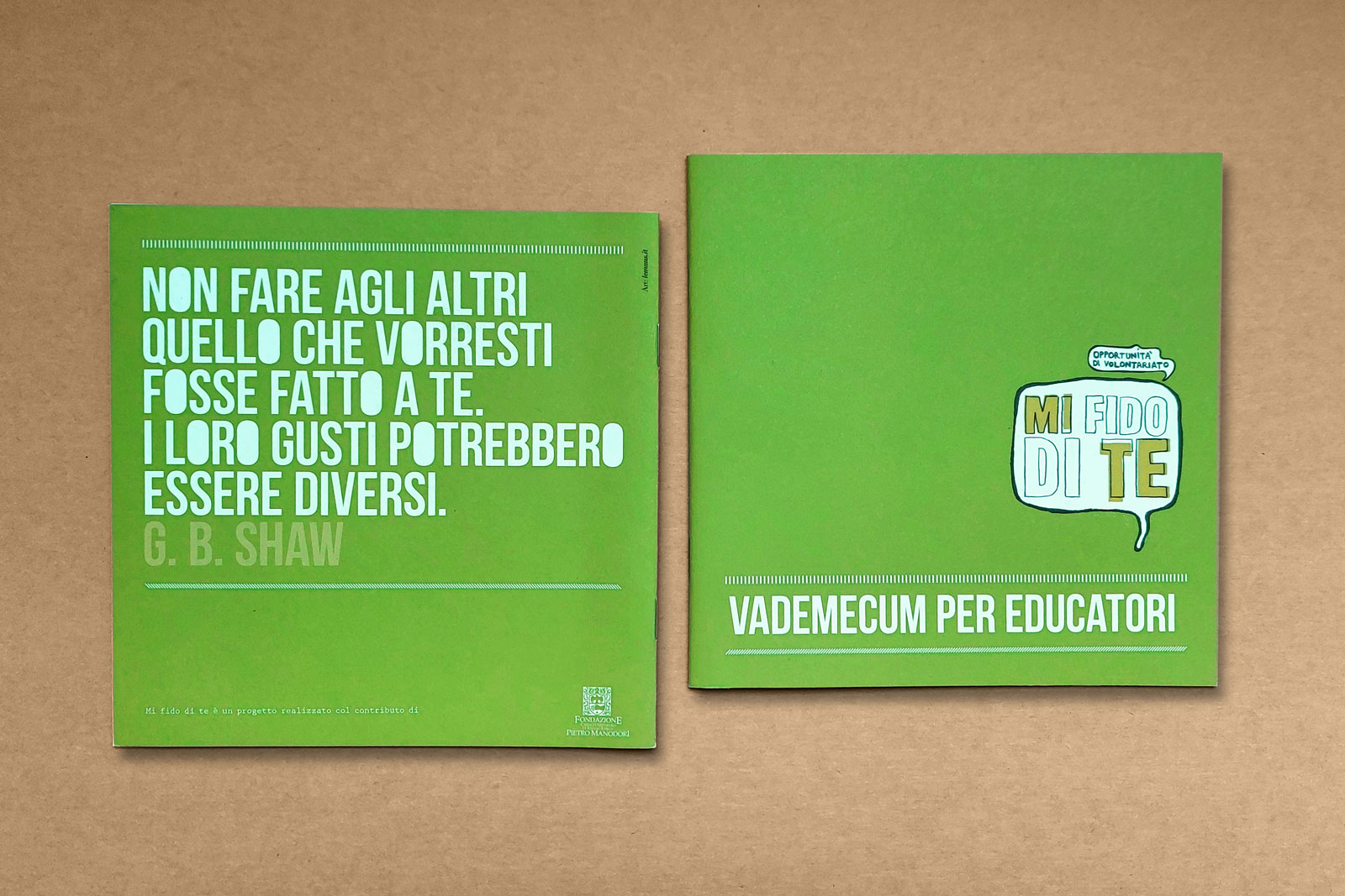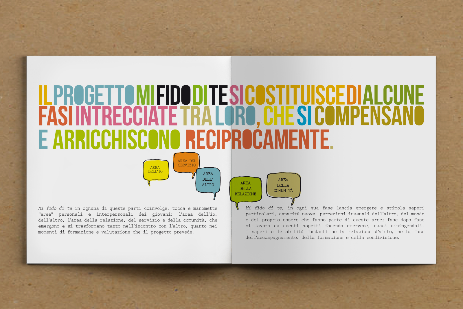 Mi fido di te è un progetto di educazione al volontariato e alla solidarietà per ragazze e ragazzi, è una rete di persone fatta di incontri, relazioni ed attività di aiuto e sostegno. Non è scontato chi deve fidarsi di chi: chi aiuta e chi riceve aiuto? Il concept del logo mette al centro il dialogo e lo scambio che stanno alla base di ogni relazione di sostegno. I materiali di comunicazione, come cartoline, flyer e vademecum tascabili, sono abitati da discorsi, opinioni, esperienze, ma soprattutto da personaggi illustrati che vivono nel mondo del volontariato.