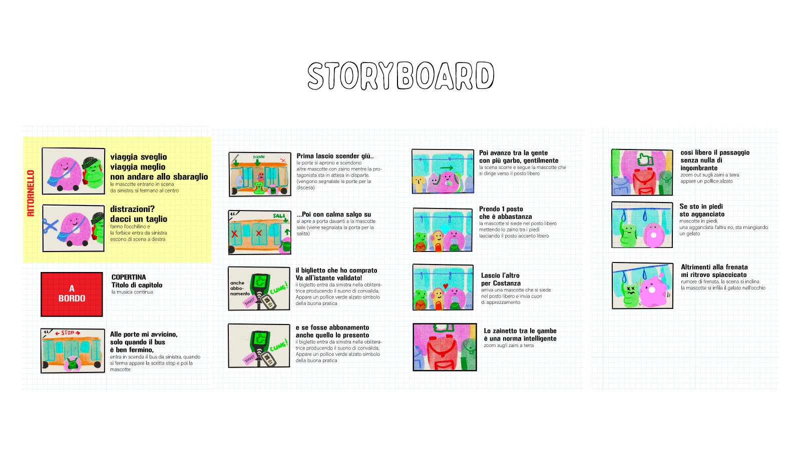 Viaggio sveglio viaggio meglio è la campagna di sensibilizzazione sul tema del viaggiare sicuri sui mezzi pubblici e sul corretto comportamento da tenere pensata per i giovani, promossa dall’Agenzia della Mobilità di Reggio Emilia e da Seta. Per la campagna sono state create brevi clip video che rappresentano i comportamenti da seguire. Abbiamo realizzato le illustrazioni e il video partendo dalla progettazione dello script e dello storyboard, utilizzando uno stile e un tono di voce ironico e visivamente colorato e attraente.
