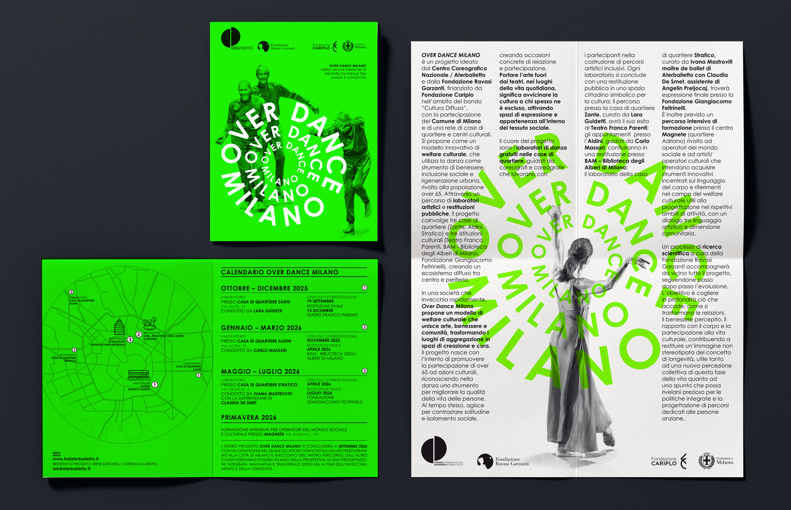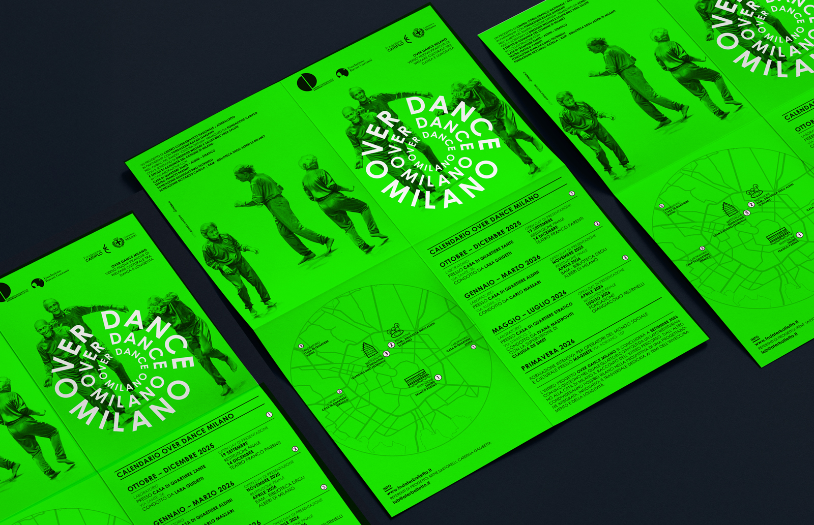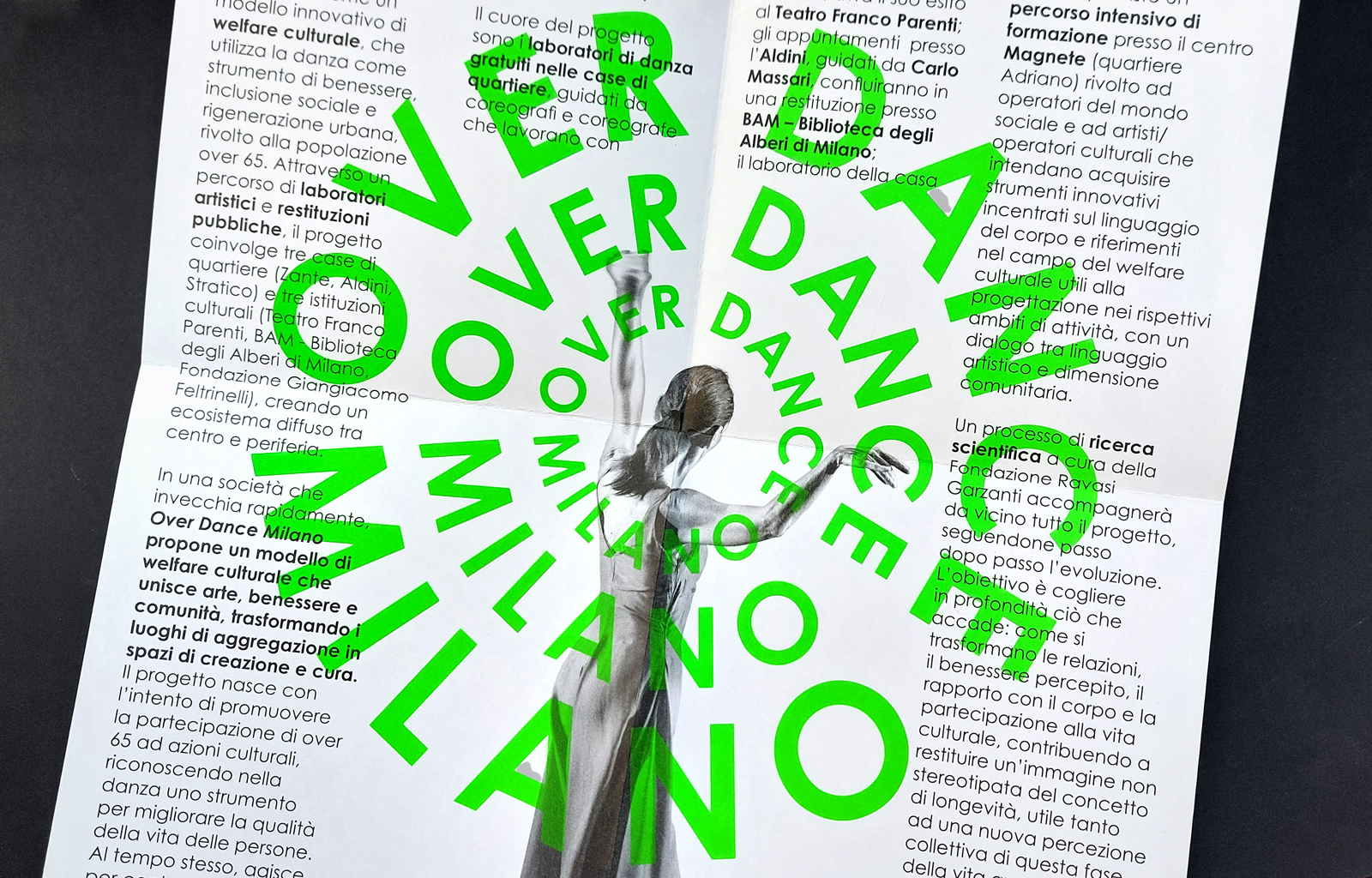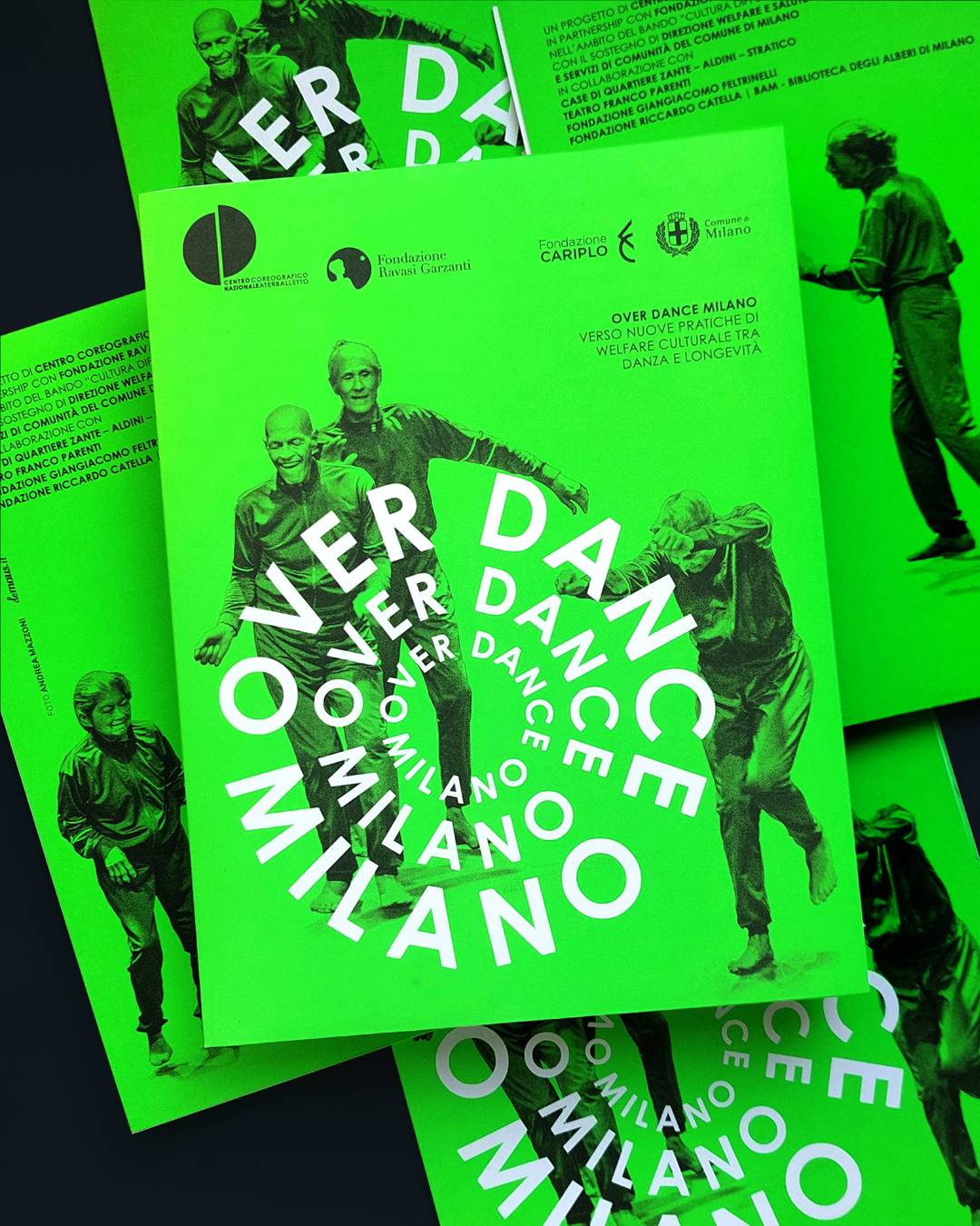 Over Dance Milano – Verso nuove pratiche di welfare culturale tra danza e longevità è un progetto del Centro Coreografico Nazionale/ Aterballetto e Fondazione Ravasi Garzanti, finanziato da Fondazione Cariplo con la partecipazione del Comune di Milano e di una rete di case di quartiere e centri culturali. Over dance Milano si propone come modello innovativo di welfare culturale, che utilizza la danza come strumento di benessere, inclusione sociale e rigenerazione urbana, rivolto alla popolazione over 65. L’identità visiva è fatta di parole protagoniste di una coreografia che si espande da un centro, quello di Milano, verso una periferia, quella delle case di quartiere. Il logo è danza, gruppo in movimento, nuova idea di rigenerazione personale e urbana. Il verde, potenziato dalla nuance fluo, giocando in pieno contrasto col nero, parla di rinnovamento e crescita continua.