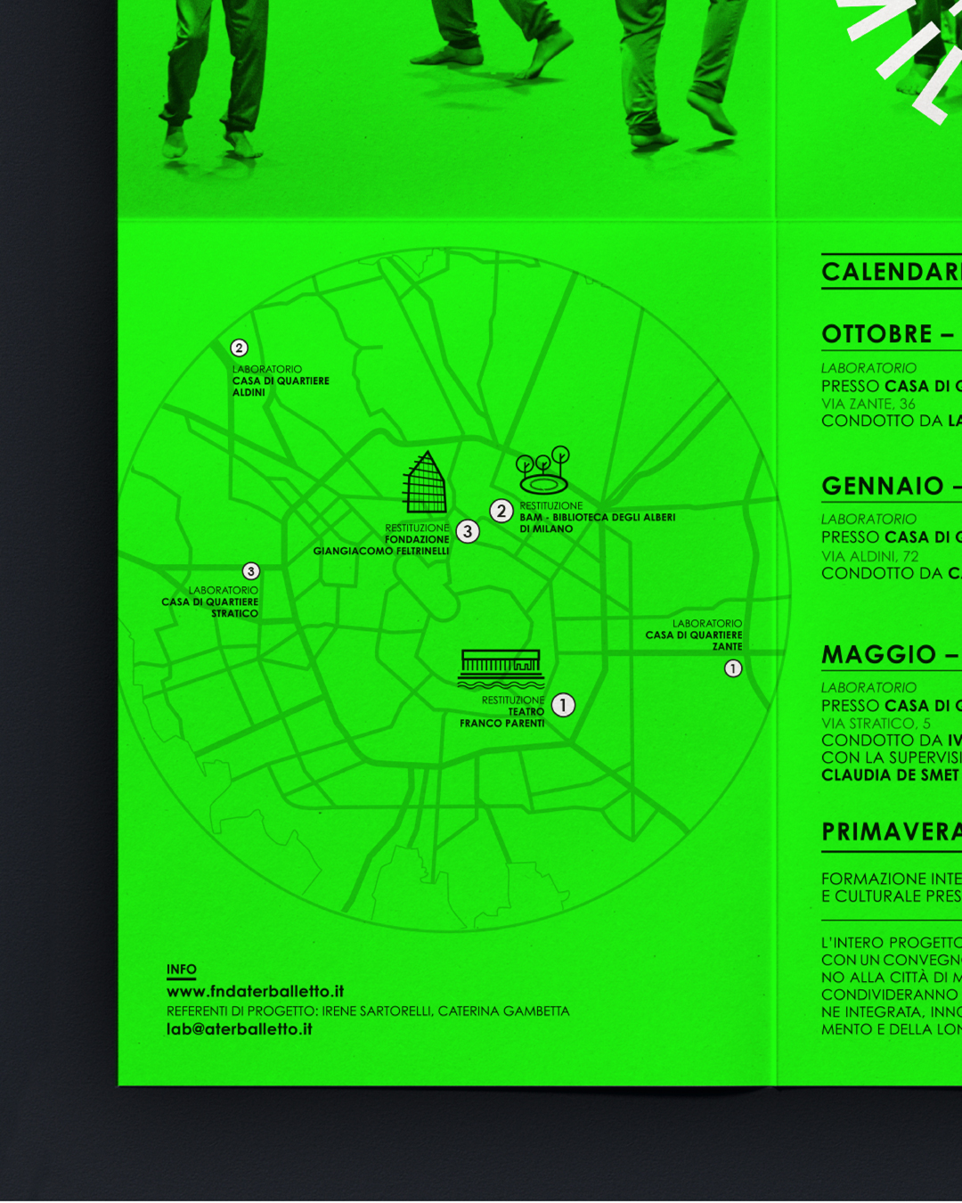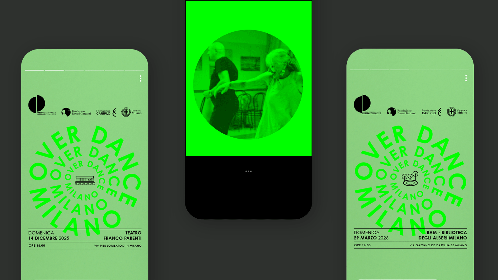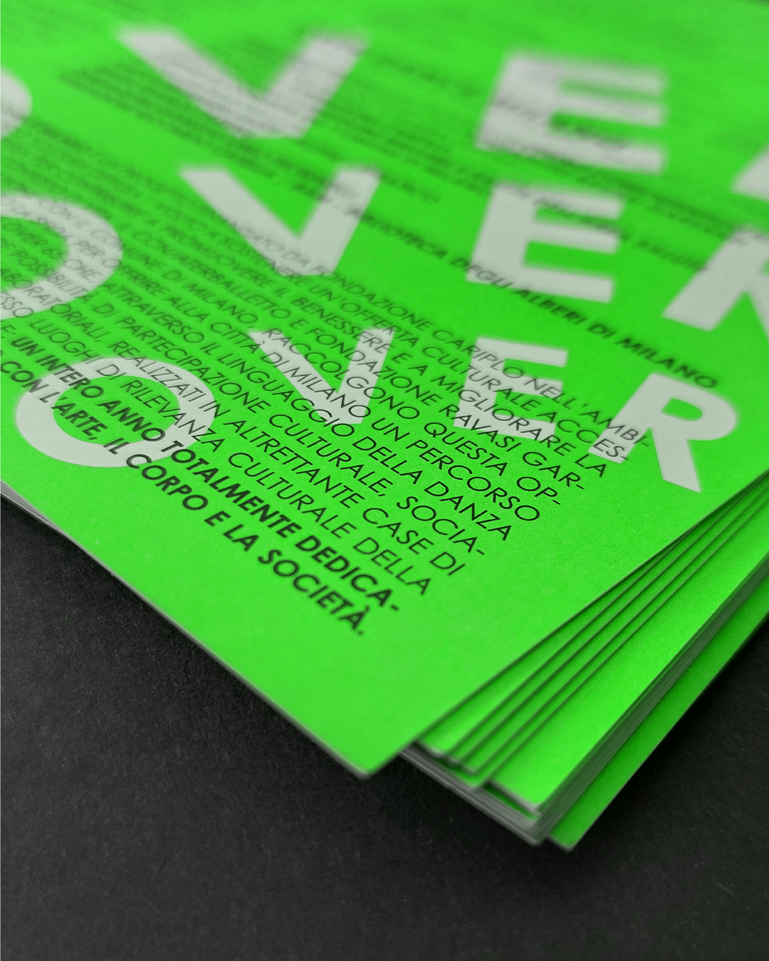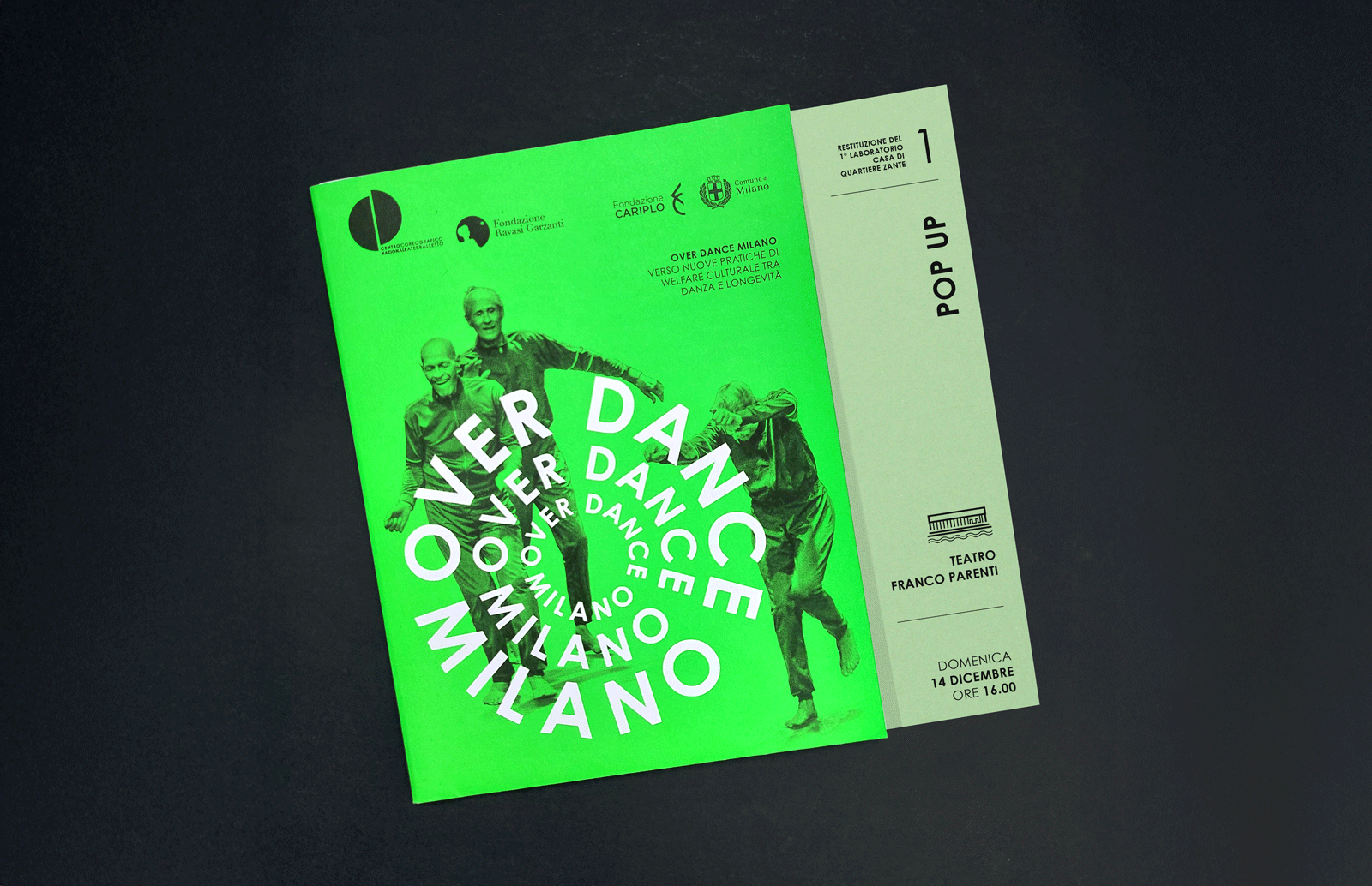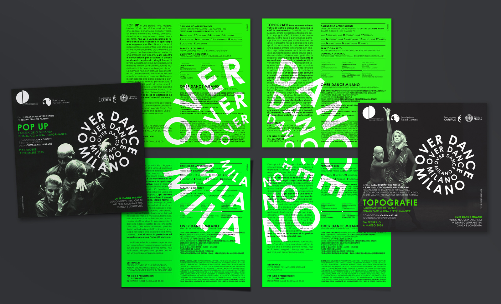 Over Dance Milano – Verso nuove pratiche di welfare culturale tra danza e longevità è un progetto del Centro Coreografico Nazionale/ Aterballetto e Fondazione Ravasi Garzanti, finanziato da Fondazione Cariplo con la partecipazione del Comune di Milano e di una rete di case di quartiere e centri culturali. Over dance Milano si propone come modello innovativo di welfare culturale, che utilizza la danza come strumento di benessere, inclusione sociale e rigenerazione urbana, rivolto alla popolazione over 65. L’identità visiva è fatta di parole protagoniste di una coreografia che si espande da un centro, quello di Milano, verso una periferia, quella delle case di quartiere. Il logo è danza, gruppo in movimento, nuova idea di rigenerazione personale e urbana. Il verde, potenziato dalla nuance fluo, giocando in pieno contrasto col nero, parla di rinnovamento e crescita continua.