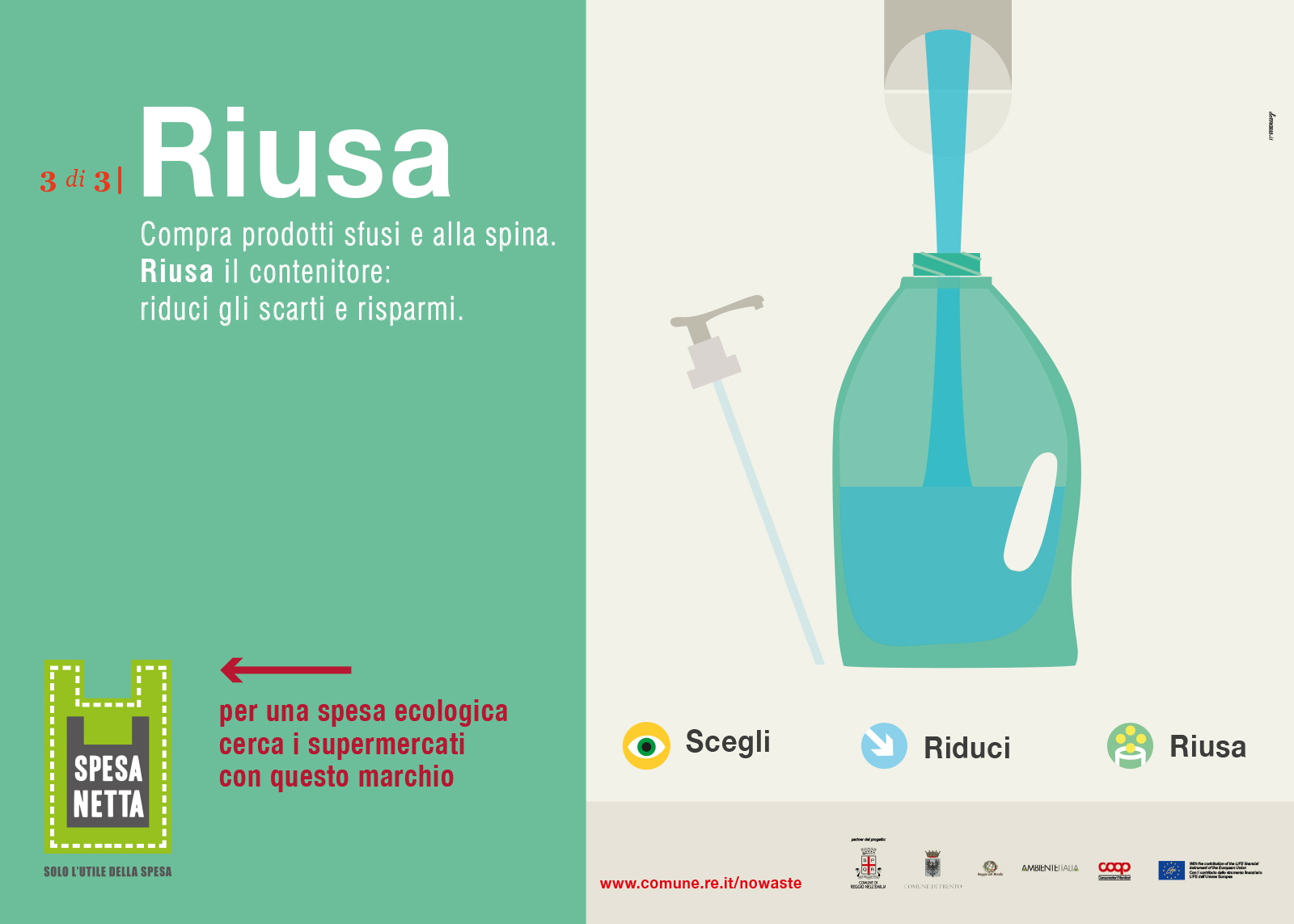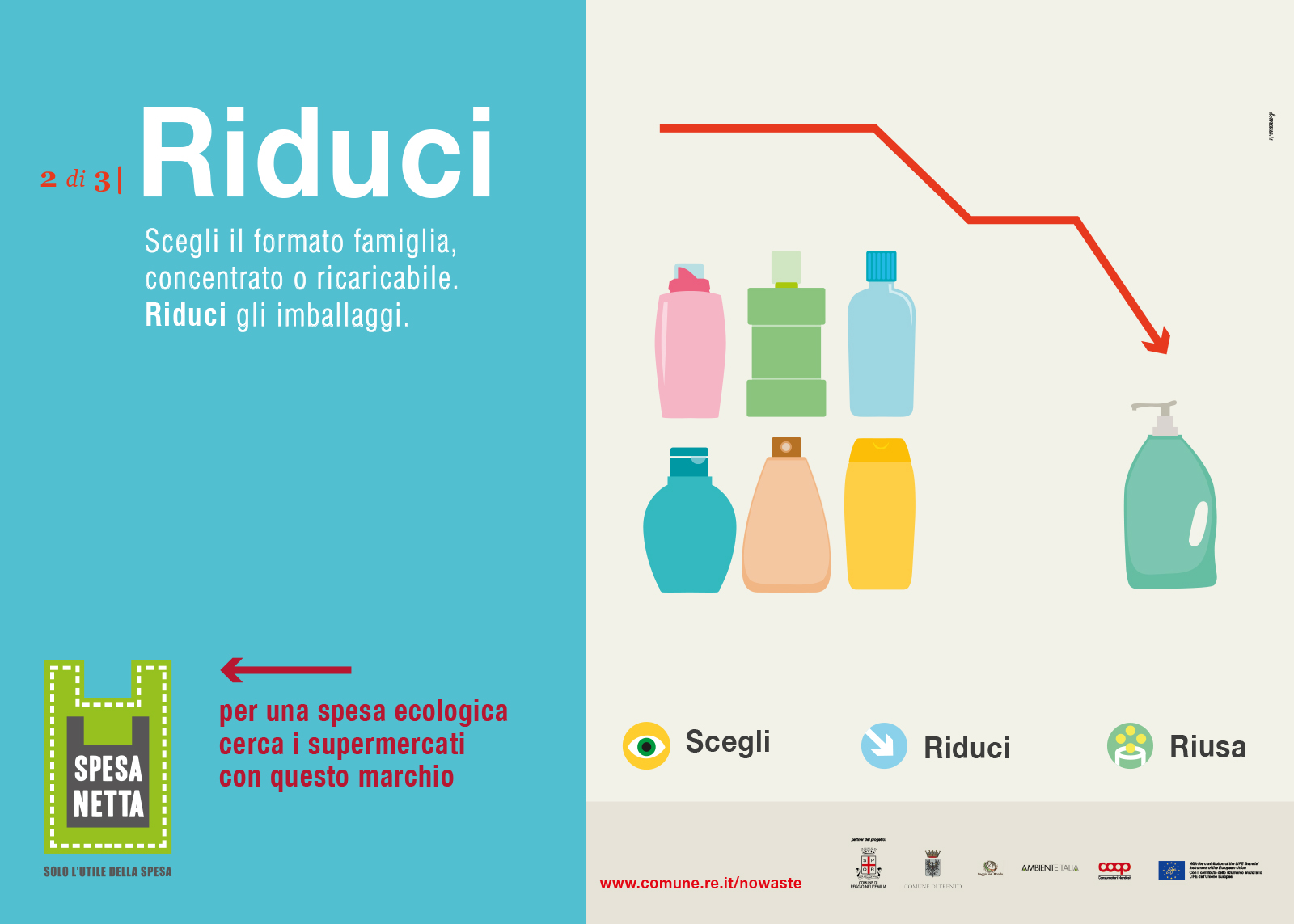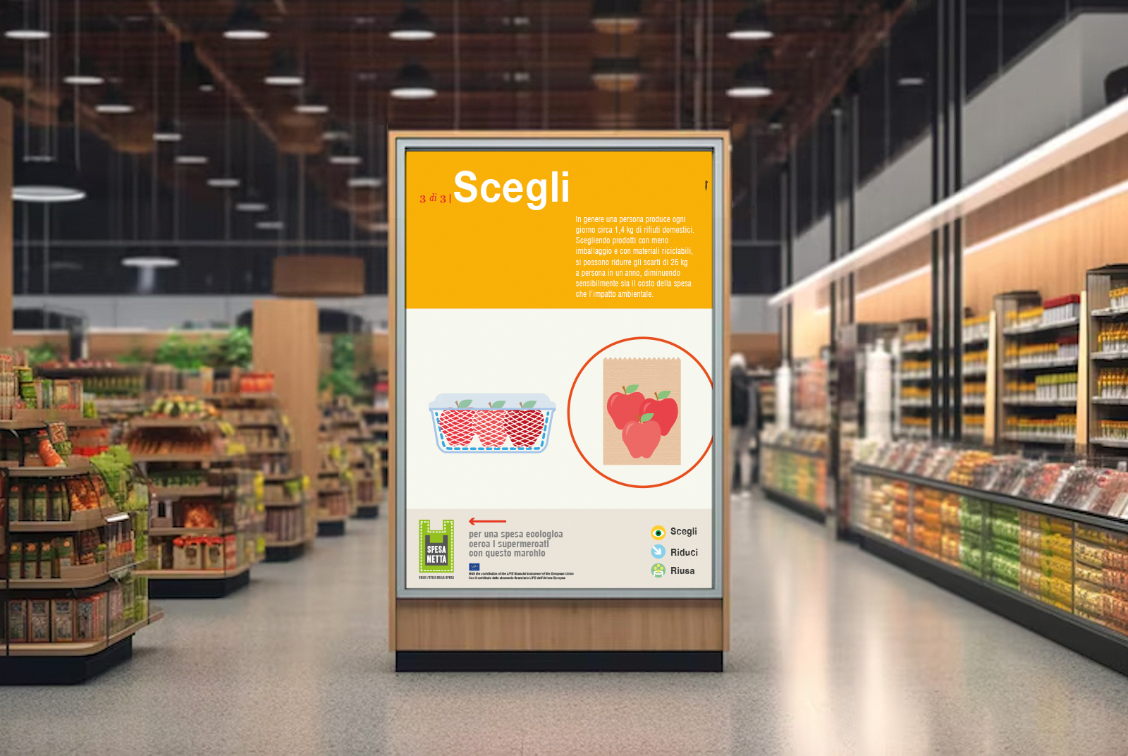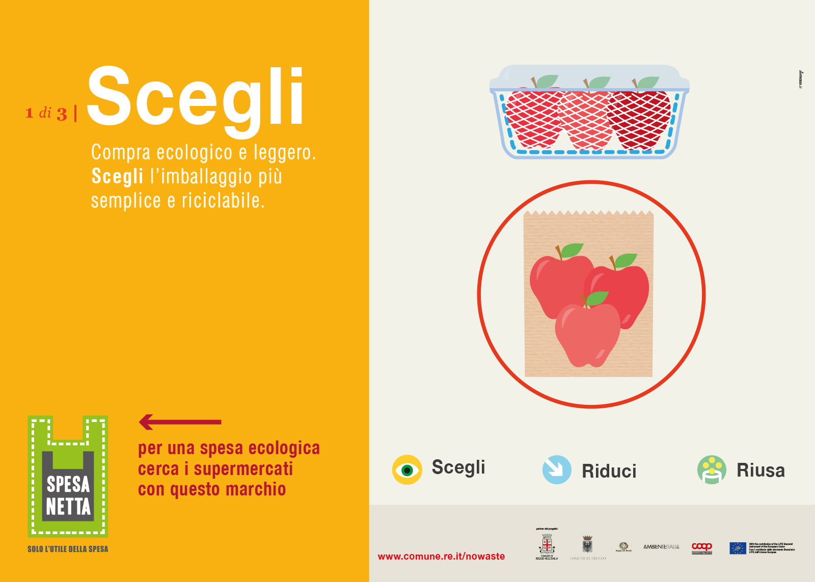 La campagna Spesa Netta, solo l’utile della spesa è stata realizzata nell’ambito del programma LIFE+ della Comunità Europea, finalizzato alla riduzione dei rifiuti all’interno delle catene di grande distribuzione. Il focus dell’azione comunicativa è costruita sulle tre principali azioni che il consumatore è invitato a compiere prima e dopo l’acquisto: Scegli, Riduci, Riusa. Il name, il logo e la brand image danno una rappresentazione visiva chiara e diretta dei concetti, così come le illustrazioni, i materiali divulgativi e gli espositori sul punto vendita. Il progetto ha previsto anche la realizzazione dello spot televisivo per le tv locali e il video di presentazione per il Convegno Internazionale “Verso un’Economia Circolare Europea”.