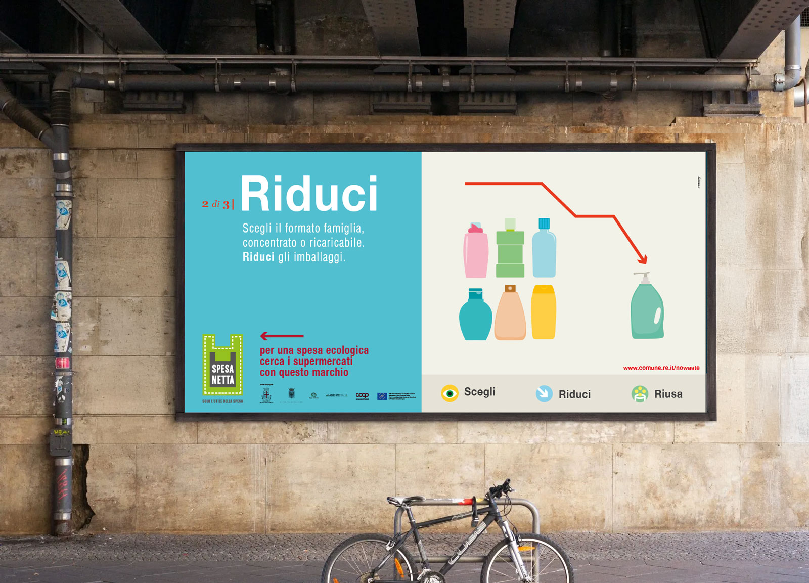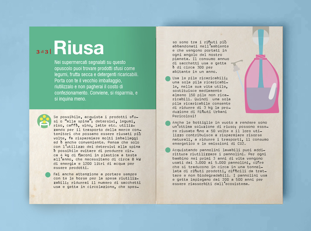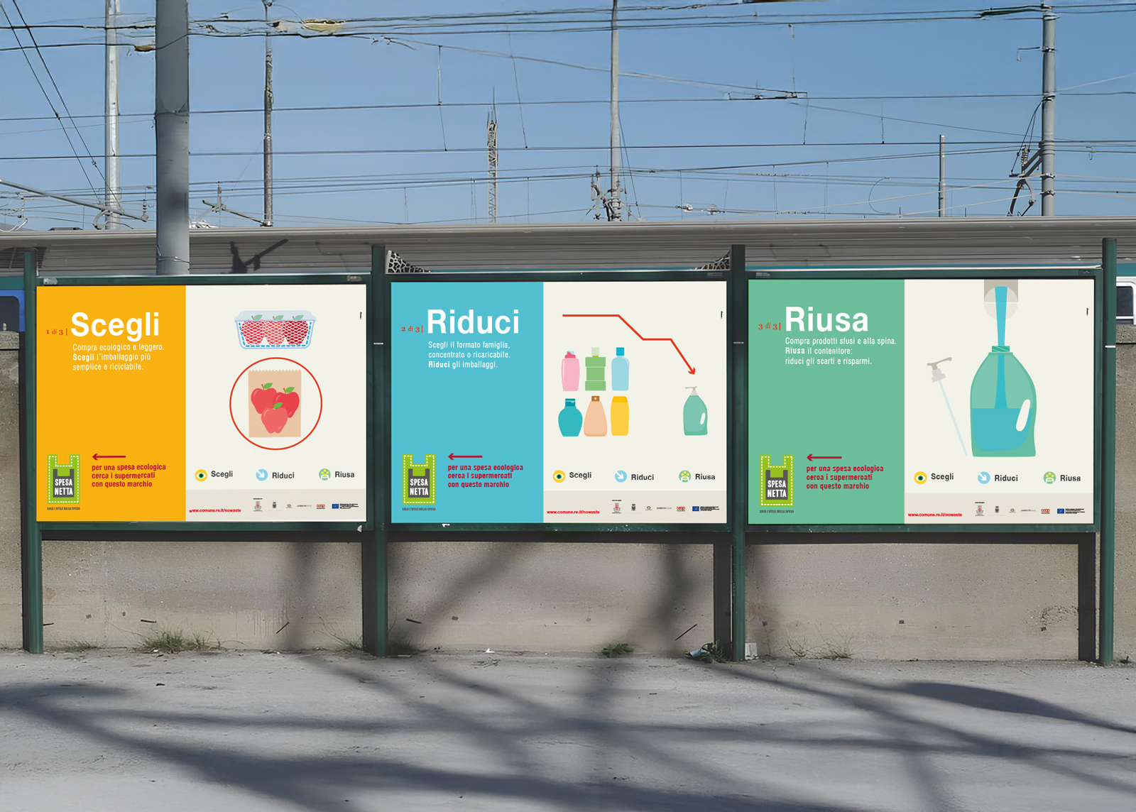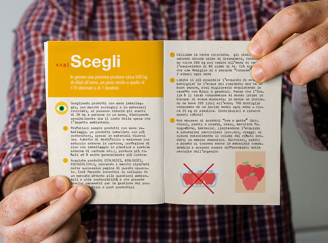 La campagna Spesa Netta, solo l’utile della spesa è stata realizzata nell’ambito del programma LIFE+ della Comunità Europea, finalizzato alla riduzione dei rifiuti all’interno delle catene di grande distribuzione. Il focus dell’azione comunicativa è costruita sulle tre principali azioni che il consumatore è invitato a compiere prima e dopo l’acquisto: Scegli, Riduci, Riusa. Il name, il logo e la brand image danno una rappresentazione visiva chiara e diretta dei concetti, così come le illustrazioni, i materiali divulgativi e gli espositori sul punto vendita. Il progetto ha previsto anche la realizzazione dello spot televisivo per le tv locali e il video di presentazione per il Convegno Internazionale “Verso un’Economia Circolare Europea”.