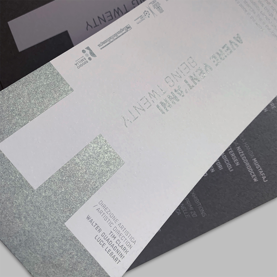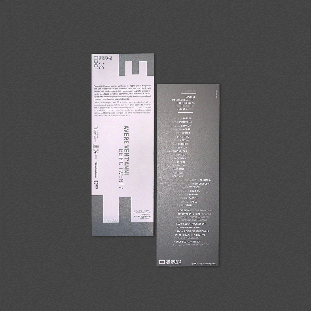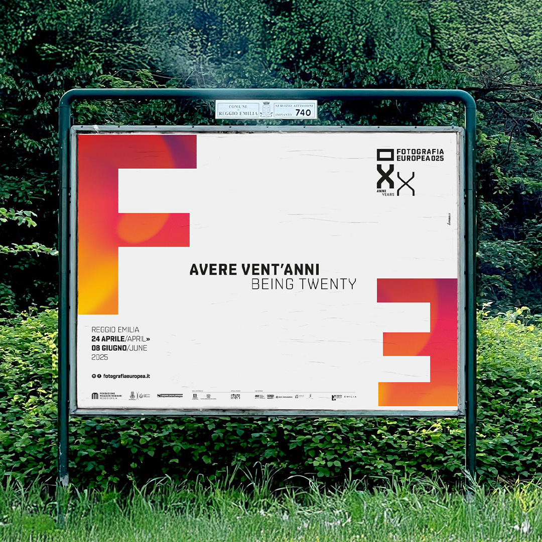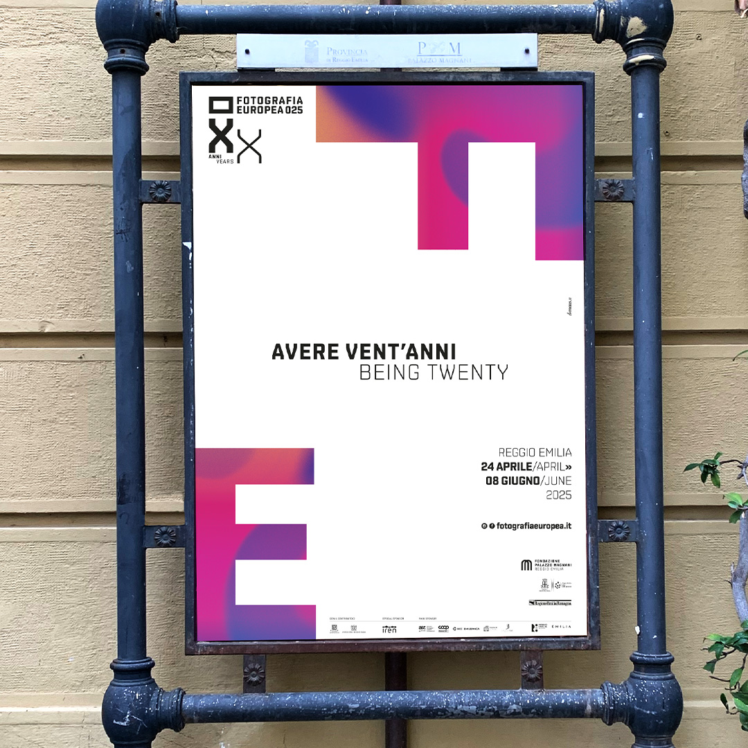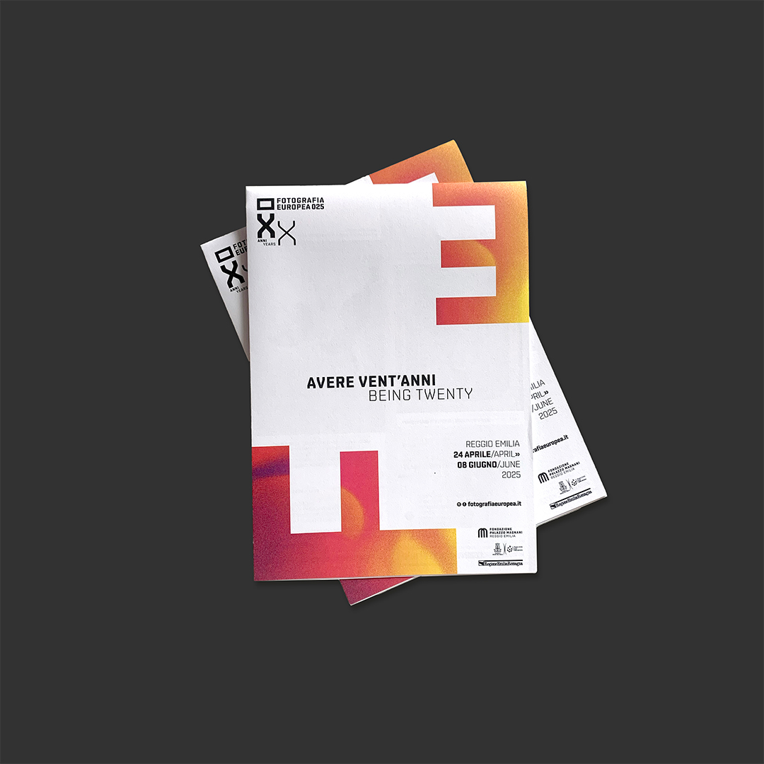 L’immagine dell’edizione del ventennale di Fotografia Europea è una pagina bianca inquadrata da sfumature cangianti, la F e la E sono libere di spostarsi, di cambiare il punto di vista. La grafica interpreta il titolo, si libera dell’immagine per evocare lo sguardo di una generazione che vive l’intensità del presente e l’incertezza del futuro, senza dare un’interpretazione univoca, mettendosi in ascolto per accogliere l’inaspettato.